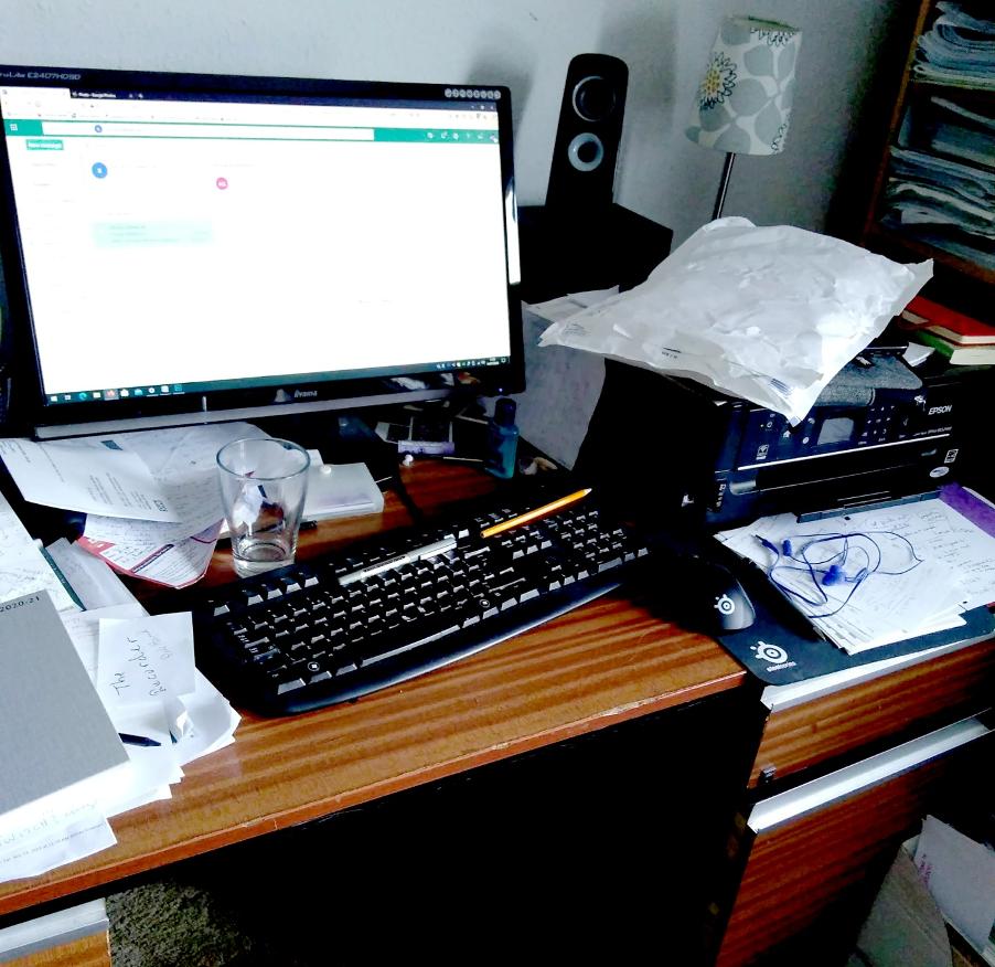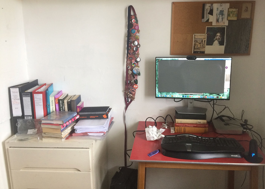 How to think about a future when it’s hard to think beyond today; when thinking about more than a few days ahead produces a sense of panic? What is the future we are already living inside of this crisis? I have spoken to friends with very different experiences, as well as students isolating in hotels, hospitals, parents’ houses, and halls of residence. People who are feeling relief that their lives finally slowed down. People slow-walking into debt. People going under with the claustrophobia of being alone, or being with small children all day every day. With migraines brought on by hours on screens, trying to find some way of empathetically connecting through the pixels, whilst inviting back pain as they sit in a corner of a kitchen, bedroom, or living room. What might come out of this that is positive? What can we learn from this intense, visceral isolation? I’ve been trying to think about what the university might look like beyond lockdown, but so far I’m struggling to think of the future. For now, here is a picture of my desk, set up at the beginning of lockdown in an attempt to create a little corner of calm in the face of rising panic.