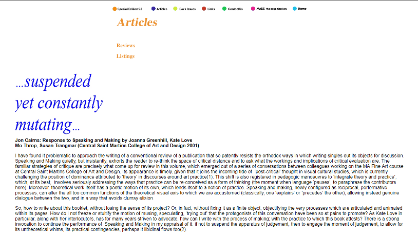 Image 4: Screenshot of archived web page from Make magazine web site “...suspended yet constantly mutating” Jon Cairns: Response to Speaking and Making by Joanna Greenhill, Kate Love, Mo Throp, Susan Trangmar