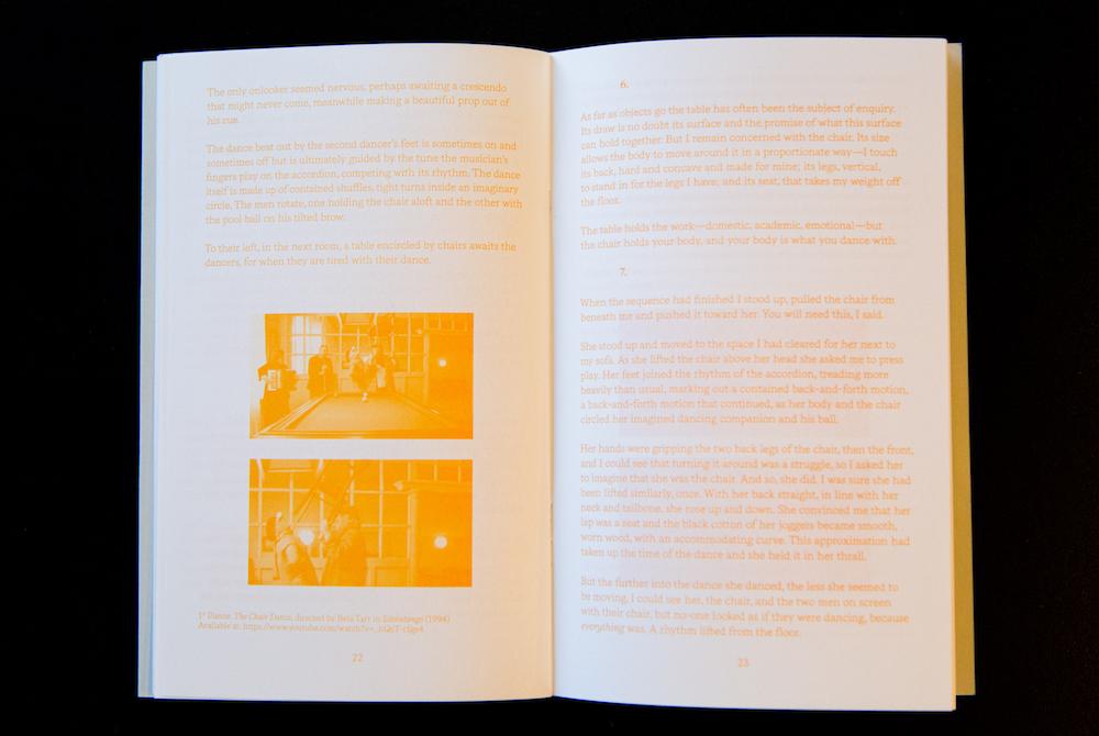 Rosie Haward’s commissioned text Duets, fictionalises an encounter with a dancer who she asks to re-stage two dances: The Chair Dance, directed by Bela Tarr in Sátántangó (1994) and Mein Herr, directed by Bob Fosse in Cabaret (1972). Radically different in style and affect, both feature chairs. Through re-staging, and inserting her own body into these dances, Haward poses questions as to who/what is dependent on whom, troubling the dividing line between object and body and collapsing the space in time between the filmed performance and her own choreography.