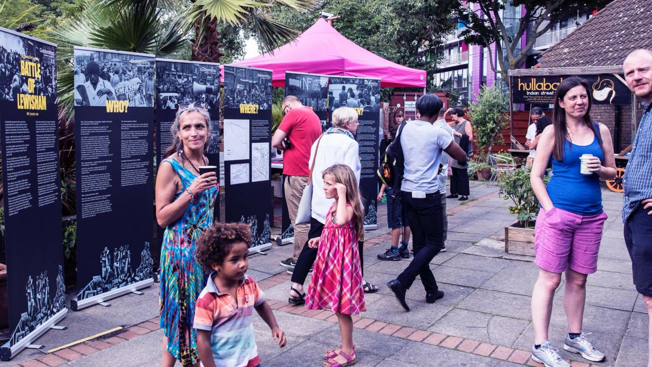 The indoor café space featured stands by six local, handpicked organisations, a Battle of Lewisham mural workshop, and fifteen hanging banners featuring iconic images and quotes about the Battle of Lewisham.