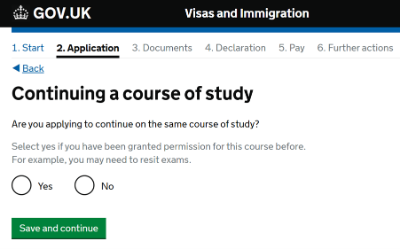 If you are continuing a course with us (for example, applying for a visa extension so that you can complete your course), please select ‘Yes’.