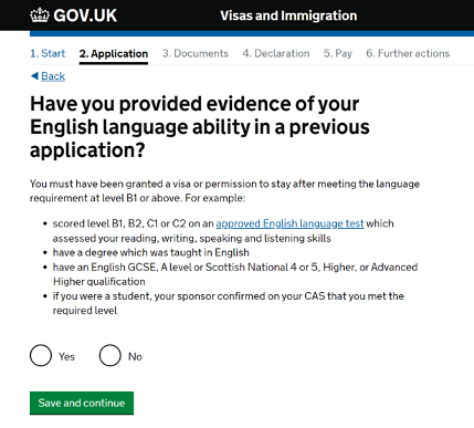 You should only answer ‘Yes’ here if you have previously provided evidence of your English language ability at the required level in a previous UK visa application.