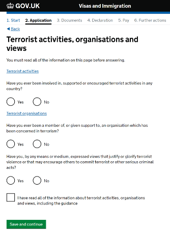 Declare any terrorist activities, organisations and views - if you are not sure whether to declare something, contact us before submitting your application.