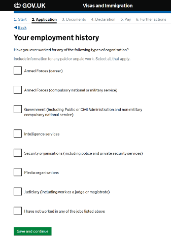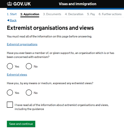 Declare any Extremist organisations and views - if you are not sure whether to declare something, contact us before submitting your application.