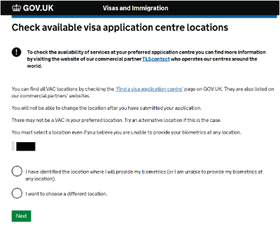 Once you have checked the link provided, ‘Find a visa application centre’, you can select ‘I have identified the location where I will provide my biometrics (or I am unable to provide my biometrics at any location)’.