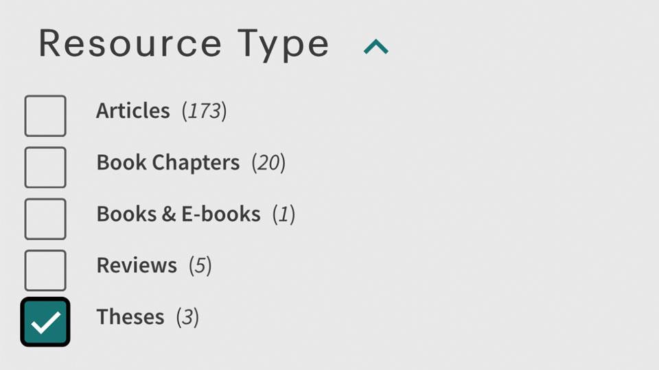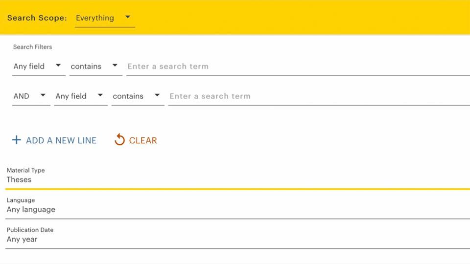 You can also use the ‘Advanced Search’ function to search for theses only by selecting ‘Theses’ in the ‘Material Type’ field.