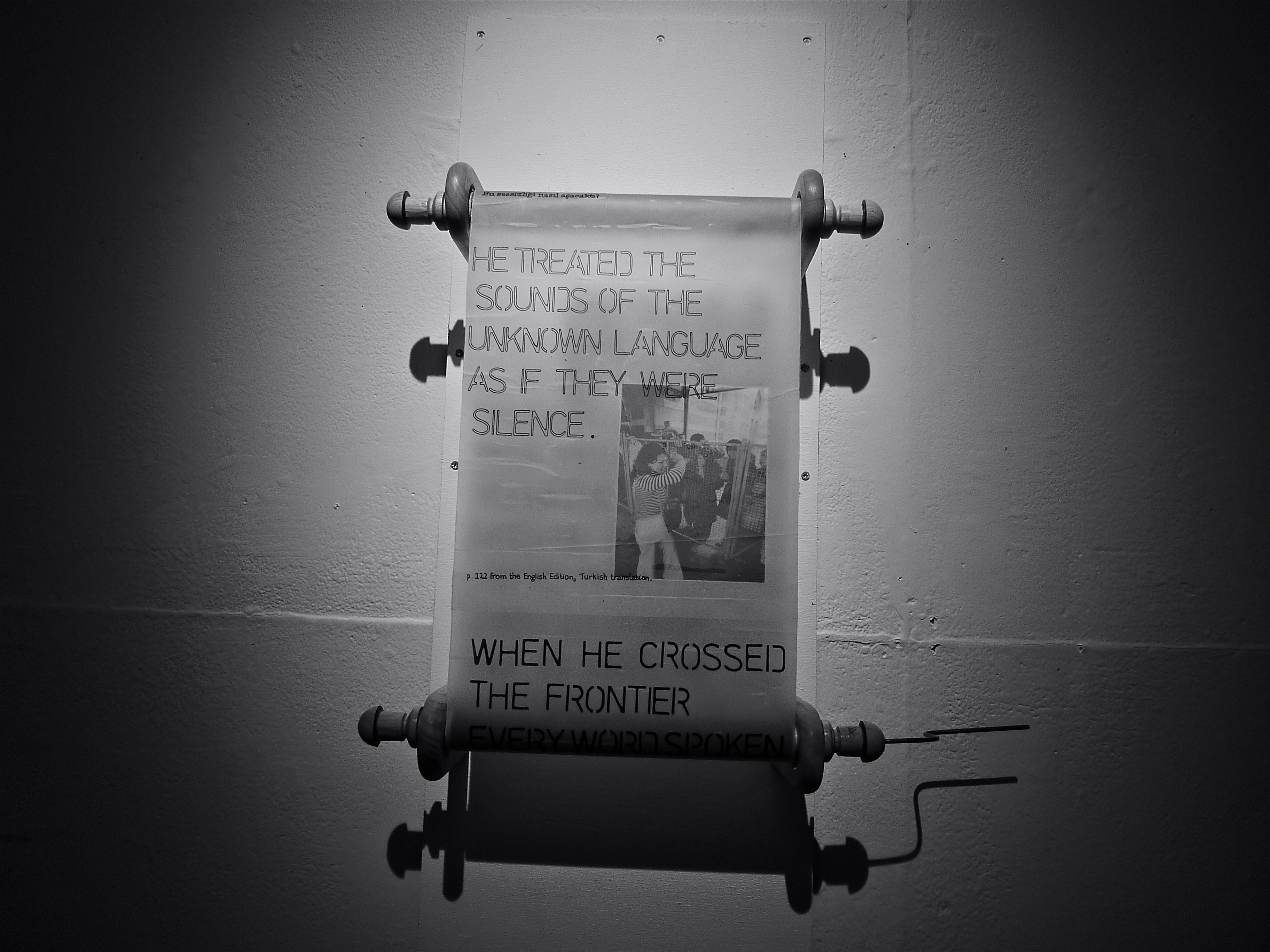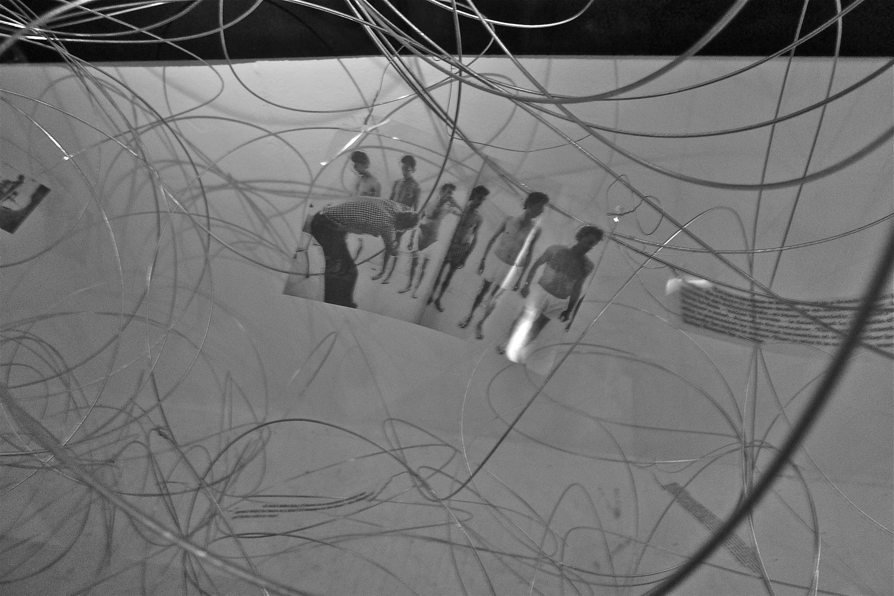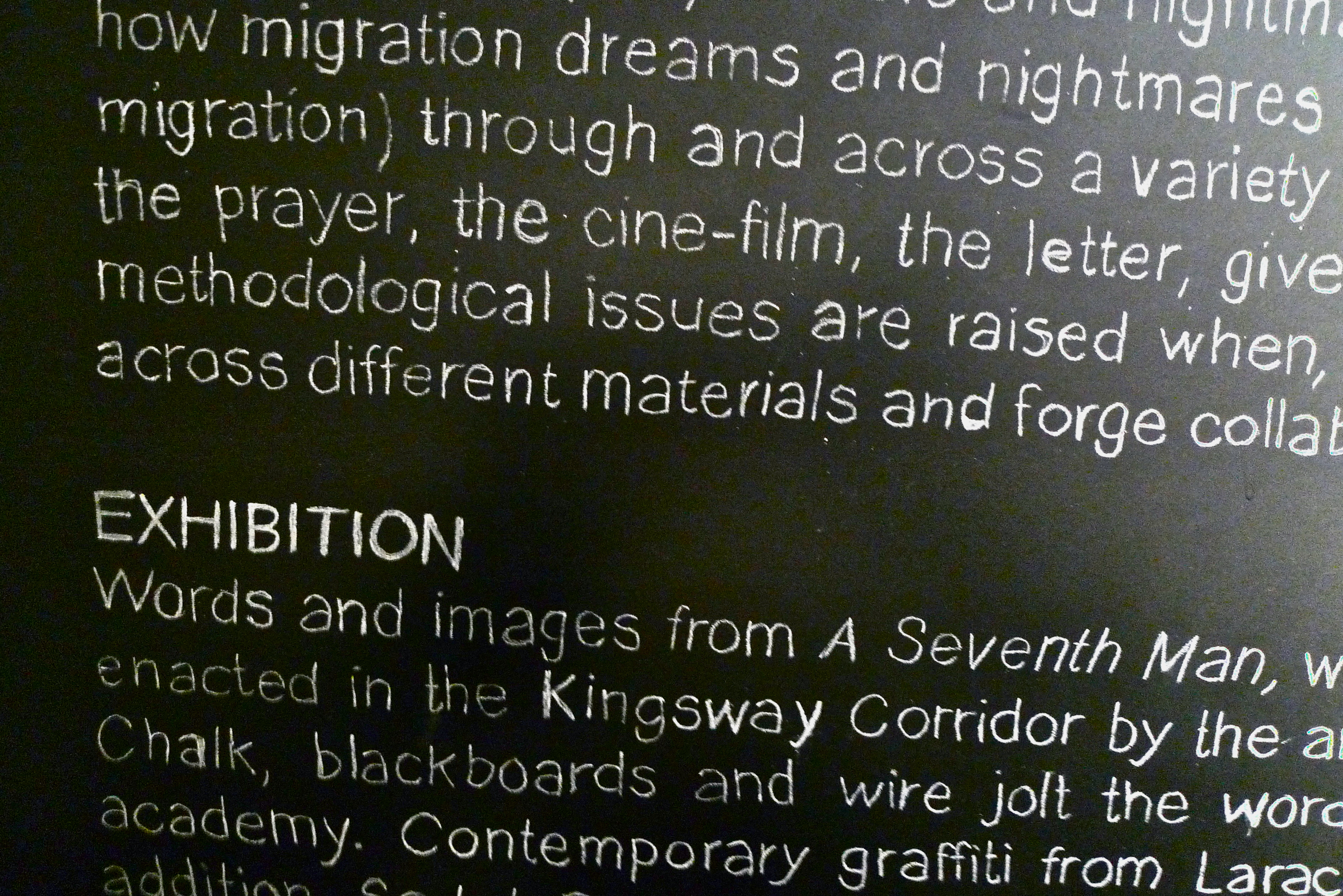 Words and images from A Seventh Man, which was translated into different languages, have been re-enacted in the Kingsway Corridor by the artist Antoinette Brown, in collaboration with Nirmal Puwar. Chalk, blackboards and wire jolt the words out of the book and onto the walls of the academy. Contemporary graffiti from Larache’s harbour sits amongst selections from the book. In addition, Sadek Rahim’s sponge boats from his project No Crash! Boom! Bang!, originally installed in the Bibliothèque Nationale d'Alger, hang in the arches of the passageway.