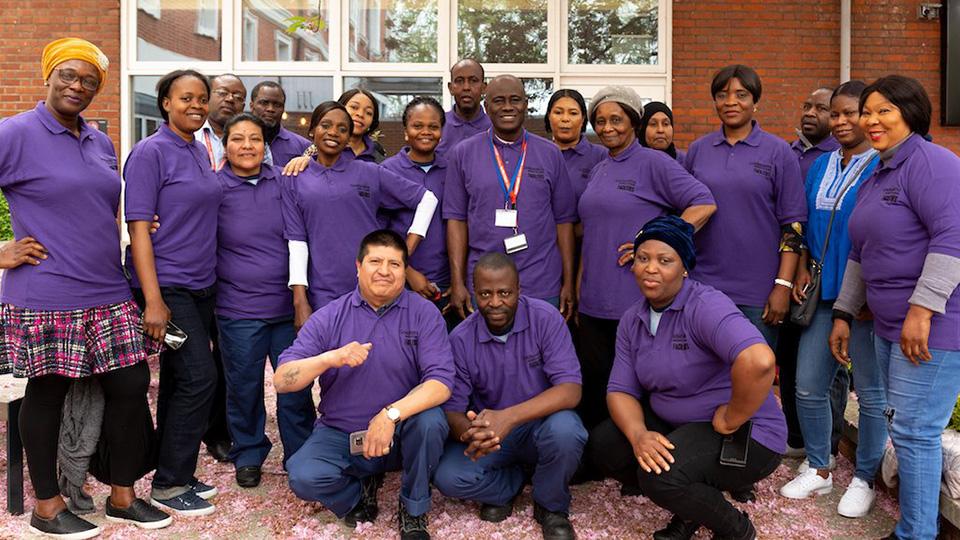 Cleaners in their uniforms after becoming Goldsmiths staff
