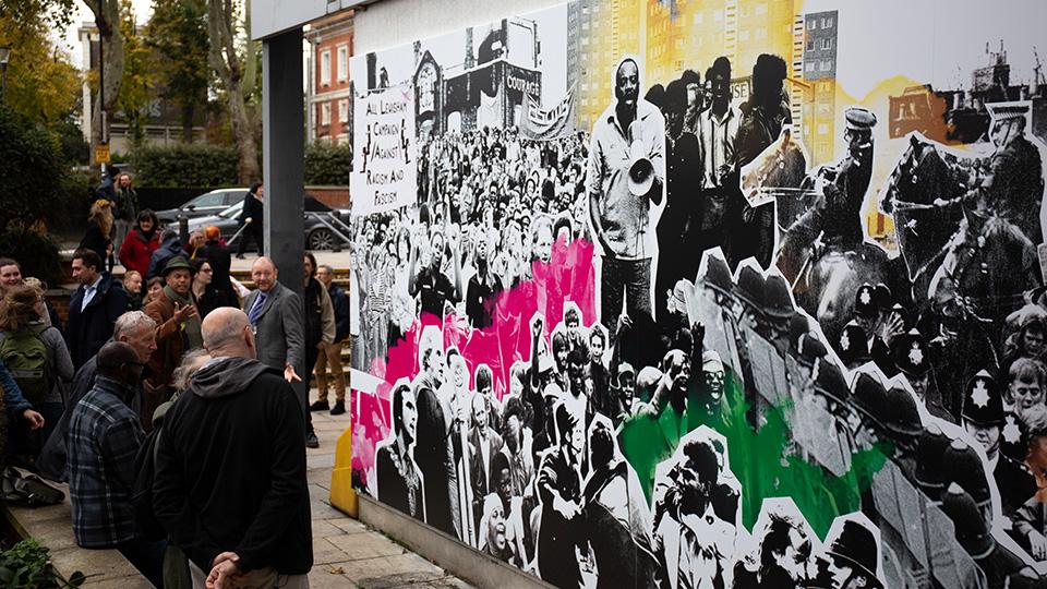The mural was created through a collaboration between local community groups and graphic designer Ted Low, a Goldsmiths graduate, and is formed from a collage of images by five photographers who captured the events of 13 August 1977.