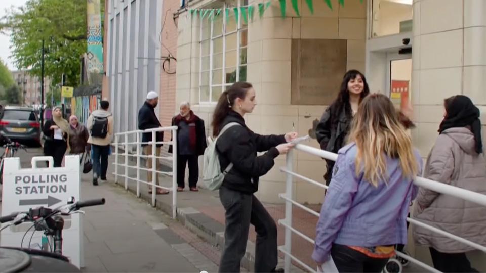 Goldsmiths students Lauren Alkhalil (L) Alice Chapman (R) and appeared on the Channel 4 item surveying voters