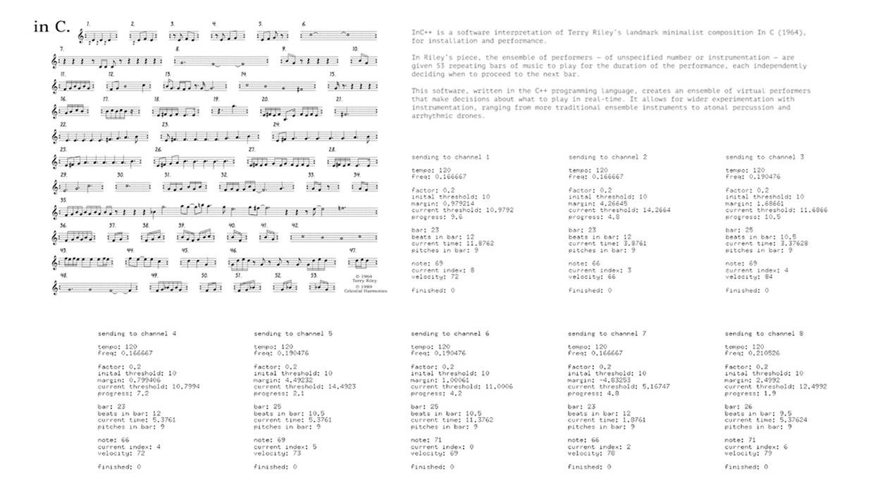 The artist explains: “I decided to choose the piece 'In C' for my MFA Computational Arts project for a number of reasons, but primarily because when performing Riley’s work, I realised that my thought process was rather algorithmic.