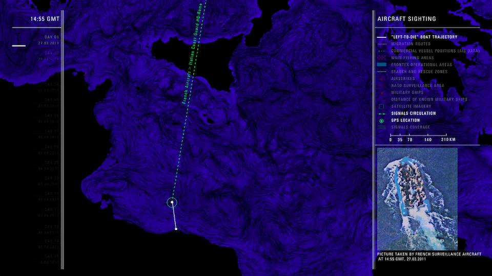 The video reconstructs the route of a small boat that was carrying 72 people away from Libya in March 2011. It was left adrift for fourteen days in NATO’s maritime surveillance area following an engine failure. Despite sending several distress signals and encounters with military helicopters and ships, sixty-three passengers died.