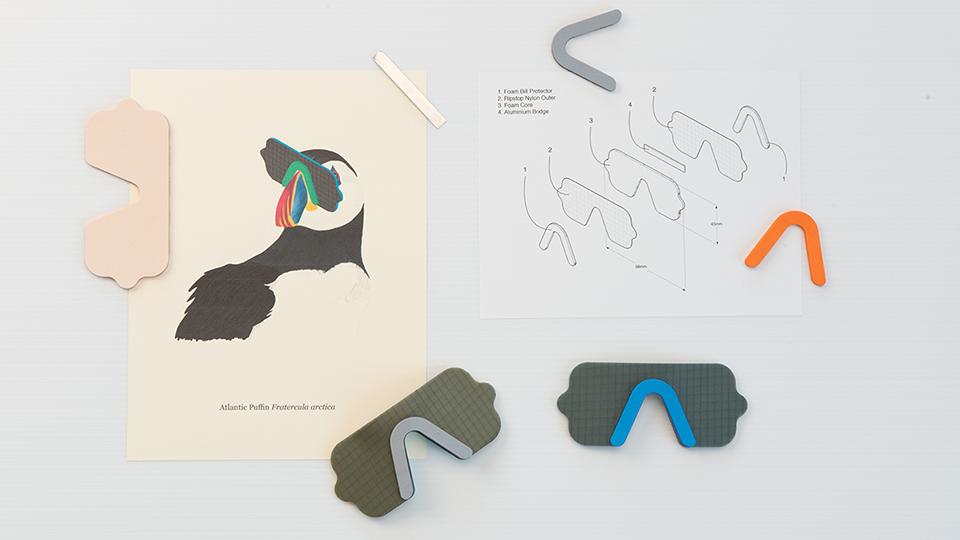 Dean Brown said: “We settled on a simple nose-resting design, making the glasses quick and unobtrusive to fit over the puffin’s bill, with a brightly coloured nose piece that bridges the animal’s distinctive bill. The material composition uses a ripstop nylon layer to create water repellent outer surface on the front and back with the core material and nose protectors in soft neoprene foam. An aluminium bridge component was introduced to enable the glasses to curve and hold to accommodate different bill and head sizes. The overall ‘sandwich’ assembly enabled a slim and light-weight design to be completely light absorbent.”