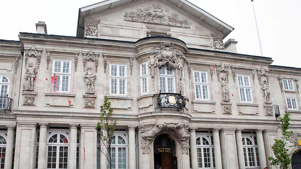 Red paint was thrown onto Deptford Town Hall in protest at the statues