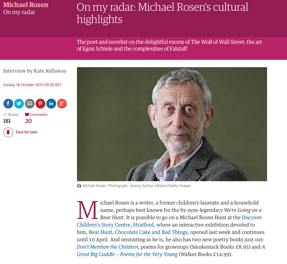Professor Michael Rosen chose some of his recent “cultural highlights” for a Guardian On My Radar feature. They include the films Everest and Wolf of Wall Street, the Leopold Museum in Vienna, and Latitude Festival.