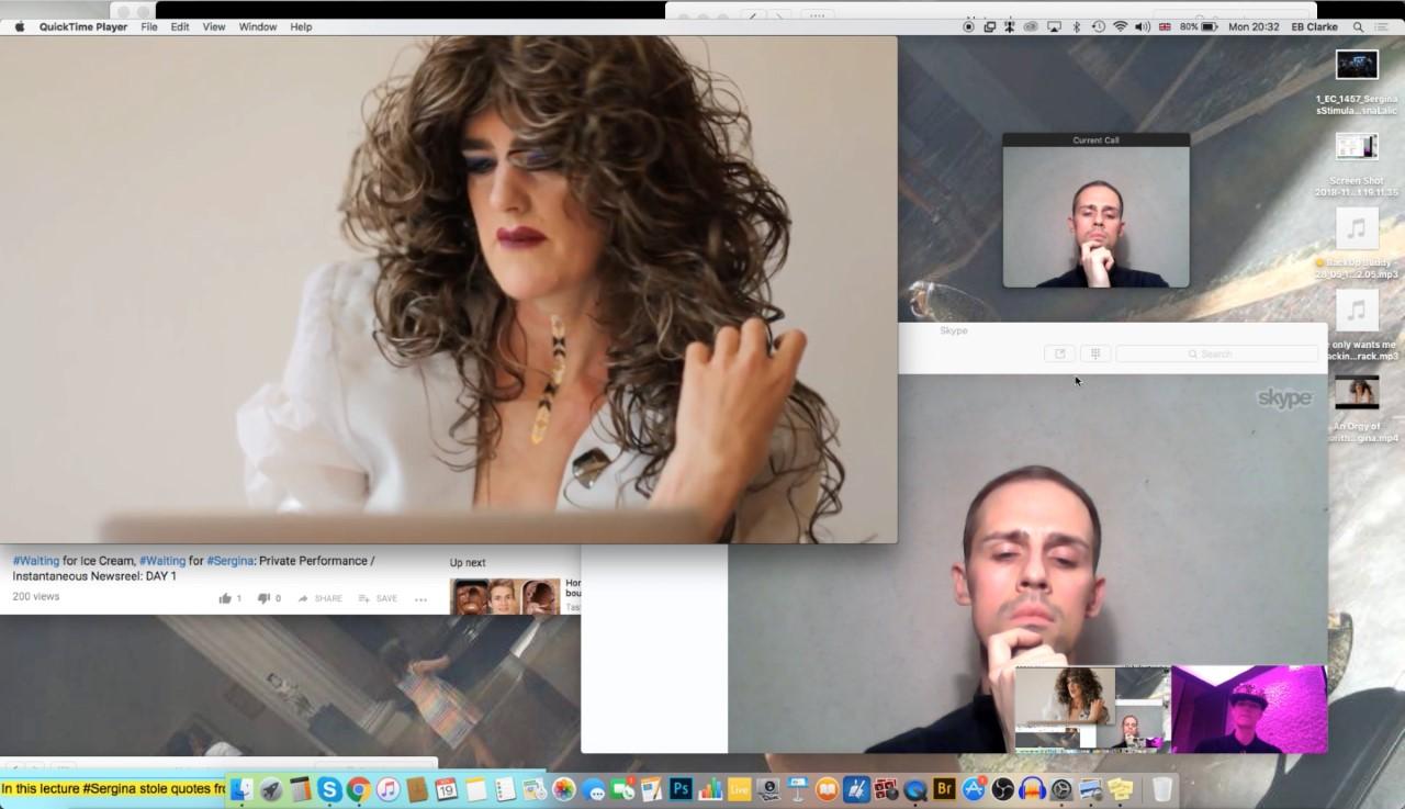 The research is performed in collaboration with my own online/offline, digital/physical (drag) alter ego #Sergina - a multi-bodied drag queen with a bunch of songs, who, in one place or several at once, on stages and on screens, alone and/or assisted by a rota of trained-up agents and backup buddies, through and across a variety of digital platforms, creates performances about love, lust and wellbeing digital age, gathering (and selling) data as she goes… But who will be eventually archived as part of this [/her] submission.