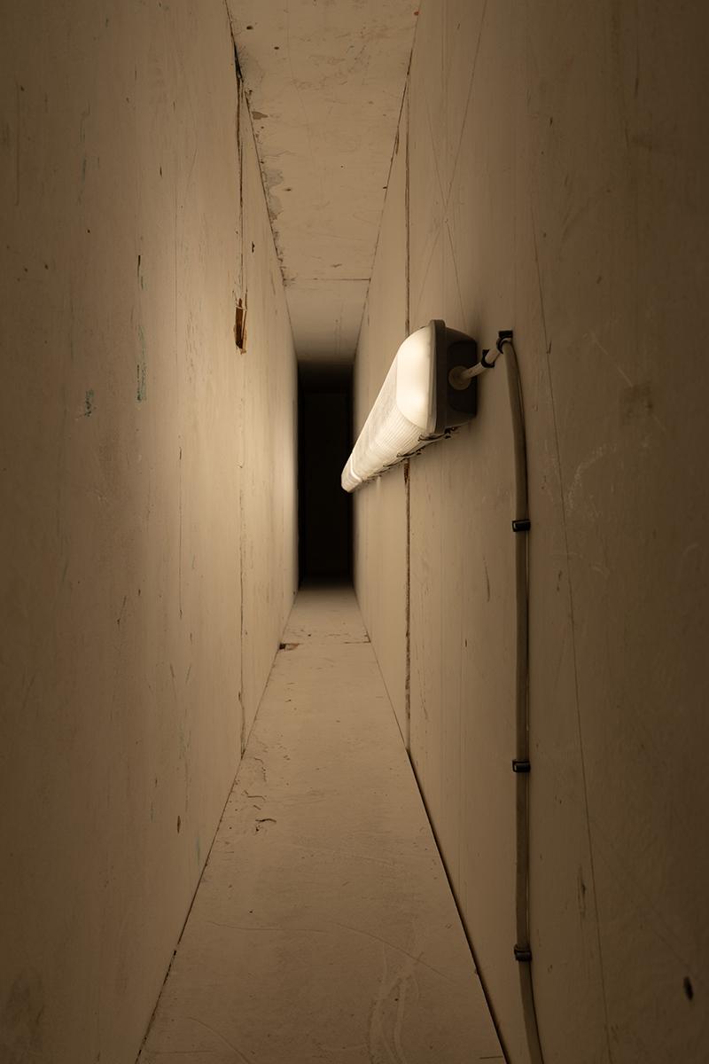From this vantage, the cavity of the wall became visible, with strip lights installed along its length contrasting the clean white exterior with the nature of the material in its raw state. All the materials used in this installation were either reclaimed building materials or given to me as gifts.