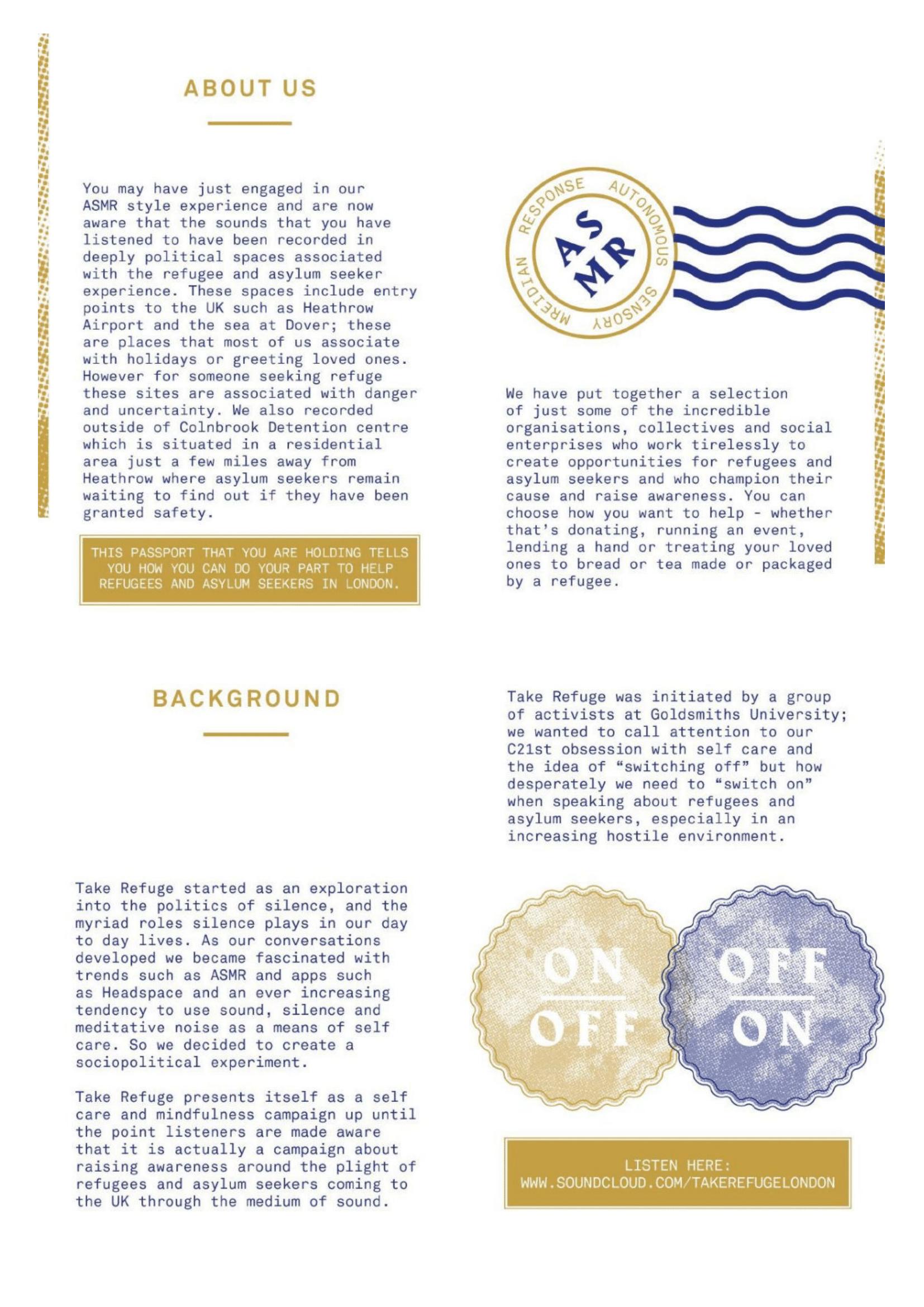 With this in mind, we have created a site-specific sound experience. The tracks you are about to listen to have been recorded in places across the UK that have different emotional and political connotations. You can also take part in the Take Refuge experience in the comfort of your own home on your phone – find yourself a comfortable space and press play. Let us take you on this journey.