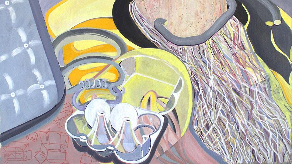 "My work explores symbols of the domestic life, patterns, anatomical forms, objects which I then assemble and puzzle together to question human interrelationships and hierarchies within genders.