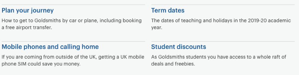 These are the rules and guides for the layout of landing and navigating pages for Goldsmiths areas and services.